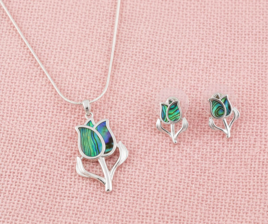Aretes en tono plateado con forma de flor con piedra abulón.