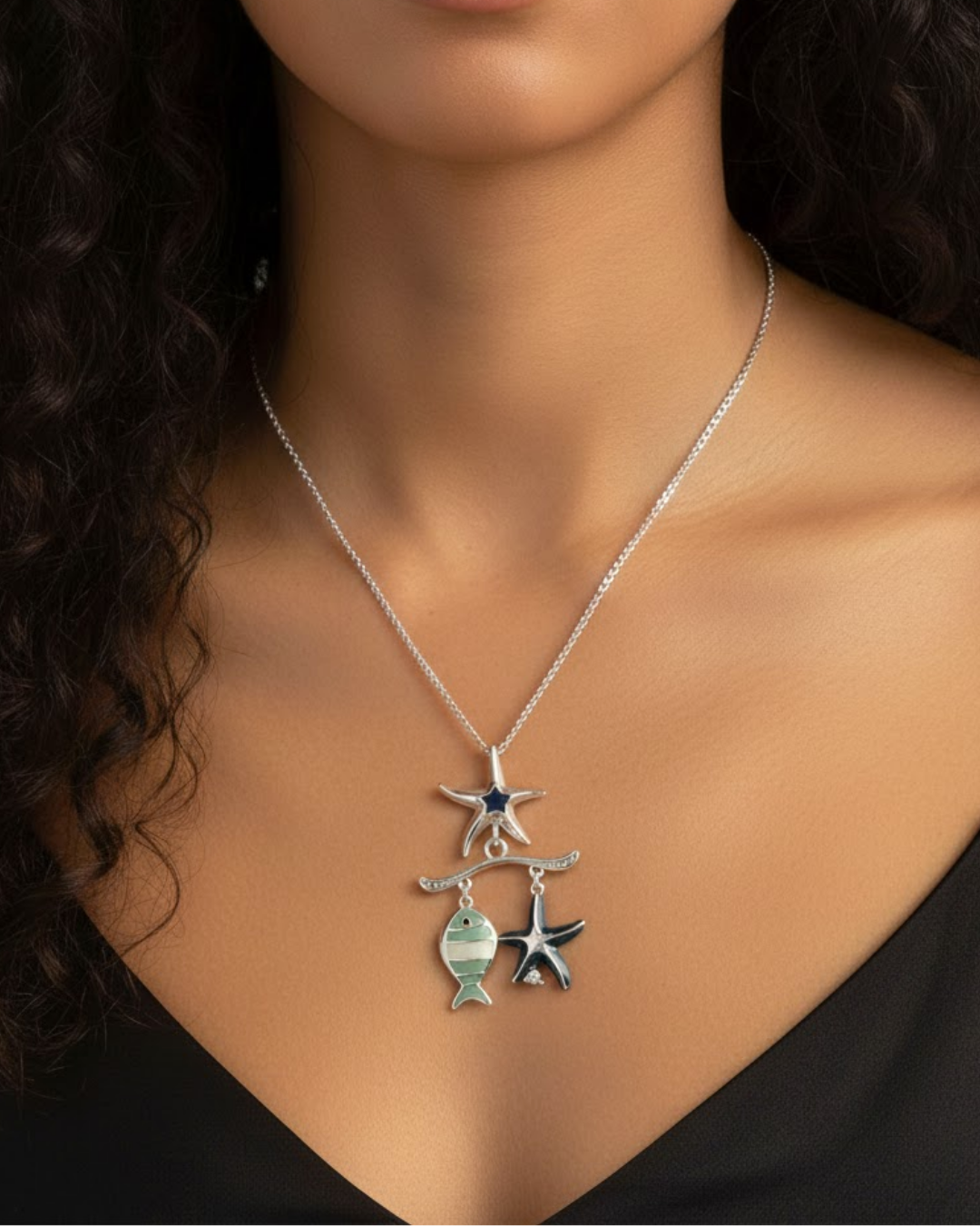 Collar en tono plateado en forma de estrella marina con dije de pez con esmalte turquesa y blanco.